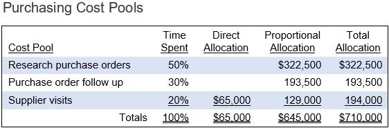 The travel and entertainment portion of the department’s expenses are clearly associated with the supplier visits activity, so he shifts that entire cost to the Supplier Visits cost pool. All remaining costs are allocated among the cost pools based on the staff time spent on each one.