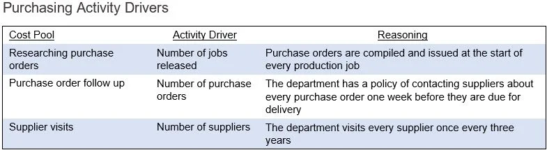 The ABC study indicates high costs at the activity driver level for all three cost pools. The key issue was how the ABC research uncovered the existence of two purchasing department policies that were significant factors in driving up the cost of the department. By altering the policies, the company was able to eliminate a large part of its purchasing expense.