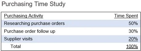 He then conducts a time study in the purchasing department to determine which activities consume the staff’s time. He compiles the following information:
