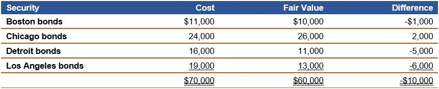 For example, Hilltop Corporation buys $35,000 of equity securities, which it then classifies as available-for-sale. After one month, the market price of the securities reduces the investment value to $33,000. In the second month, a change in the market price increases the investment value to $36,000, after which Hilltop sells the securities. Hilltop creates the following journal entry to record the decline in value after one month: