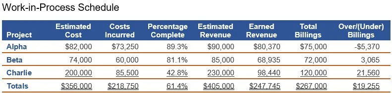 An example of a work-in-progress schedule appears in the next exhibit, where earned revenue is calculated as the total estimated revenue for a project, multiplied by the percentage complete. This number is compared to total billings to date to arrive at the over/(under) billing for a project.