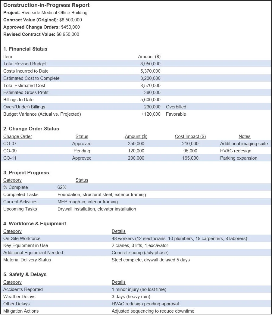 A construction-in-progress report provides a snapshot of the current status of a construction project. It lists the total project budget, funds used to date, and remaining funds, as well as the details on any approved or pending changes that impact costs. The report also notes discrepancies between projected and actual expenses. In addition to these financial issues, the report also notes which tasks have been completed, highlights current work activities, and provides an overview of upcoming tasks. In addition, the report summarizes the number and type of workers on-site, the equipment being used or which is needed, and the status of material deliveries. Further, the report itemizes any accidents that have occurred, delays and the reasons for them, and any issues impacting the progress or quality of the work. Finally, the report lists all completed quality checks, pending inspections, and any non-conformance issues found. In short, this report helps maintain transparency and ensures that all parties are informed about a project's current state, potential challenges, and future direction. A sample construction-in-progress report appears in the following exhibit.