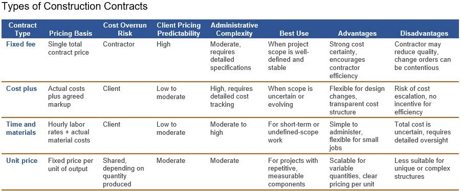 There are several types of contracts than a contractor can enter into with a client. Each type has specific characteristics that tend to favor one party or the other, depending on the circumstances. We explain each one below.