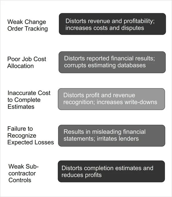 Weak control over subcontractor costs is a major concern, because subcontractor charges often represent a substantial portion of total contract costs. Without rigorous review of subcontract agreements, change orders, pay applications, and lien waivers, contractors risk overbilling, duplicate payments, or unauthorized scope expansions. Inaccurate coding of subcontractor invoices to job cost ledgers distorts percentage-of-completion calculations and gross profit estimates. Poor monitoring also impairs cost-to-complete forecasts, leading to understated loss provisions or reduced margins. Weak controls over retainage, insurance compliance, and back charges further expose the contractor to financial misstatements, cash flow strain, and disputes across multiple reporting periods.