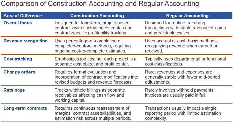 Construction accounting departs significantly from traditional accounting because it is structured around long-term, project-based work rather than routine, recurring transactions. While regular accounting emphasizes stable revenue streams, departmental expense classifications, and relatively predictable billing cycles, construction accounting must accommodate multi-year contracts, fluctuating cost estimates, and contract-specific profitability analysis. It requires the ongoing measurement of project progress, separate tracking of job-level costs, and specialized treatment of contractual provisions that affect cash flow and reported income. As a result, construction accounting incorporates unique revenue recognition models, detailed job costing systems, change order adjustments, retainage tracking, and the continuous reassessment of long-term contract performance. The key differences between these accounting concepts are noted below.