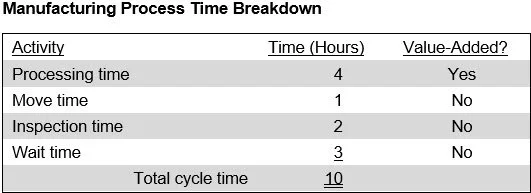 4 Hours value-added time ÷ 10 Hours total cycle time = 40% Manufacturing cycle efficiency