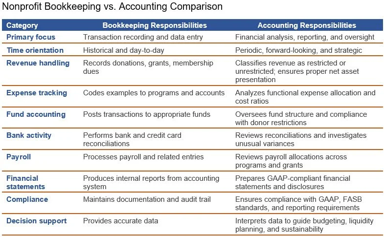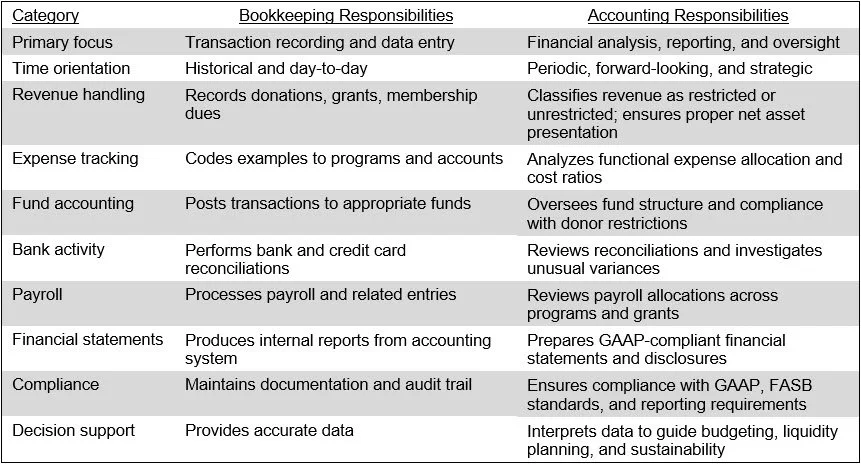 There is a clear role separation between bookkeeping and accounting. When nonprofits understand the difference, they enhance both compliance and strategic stewardship. The key differences are noted in the following table.