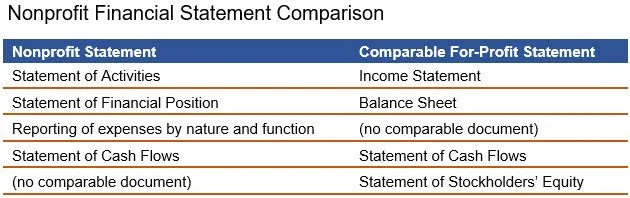 Together, these four statements provide a comprehensive view of financial condition, operating performance, cash management, and stewardship of donor resources. The following exhibit compares the financial statements generated by a nonprofit and for-profit entity.