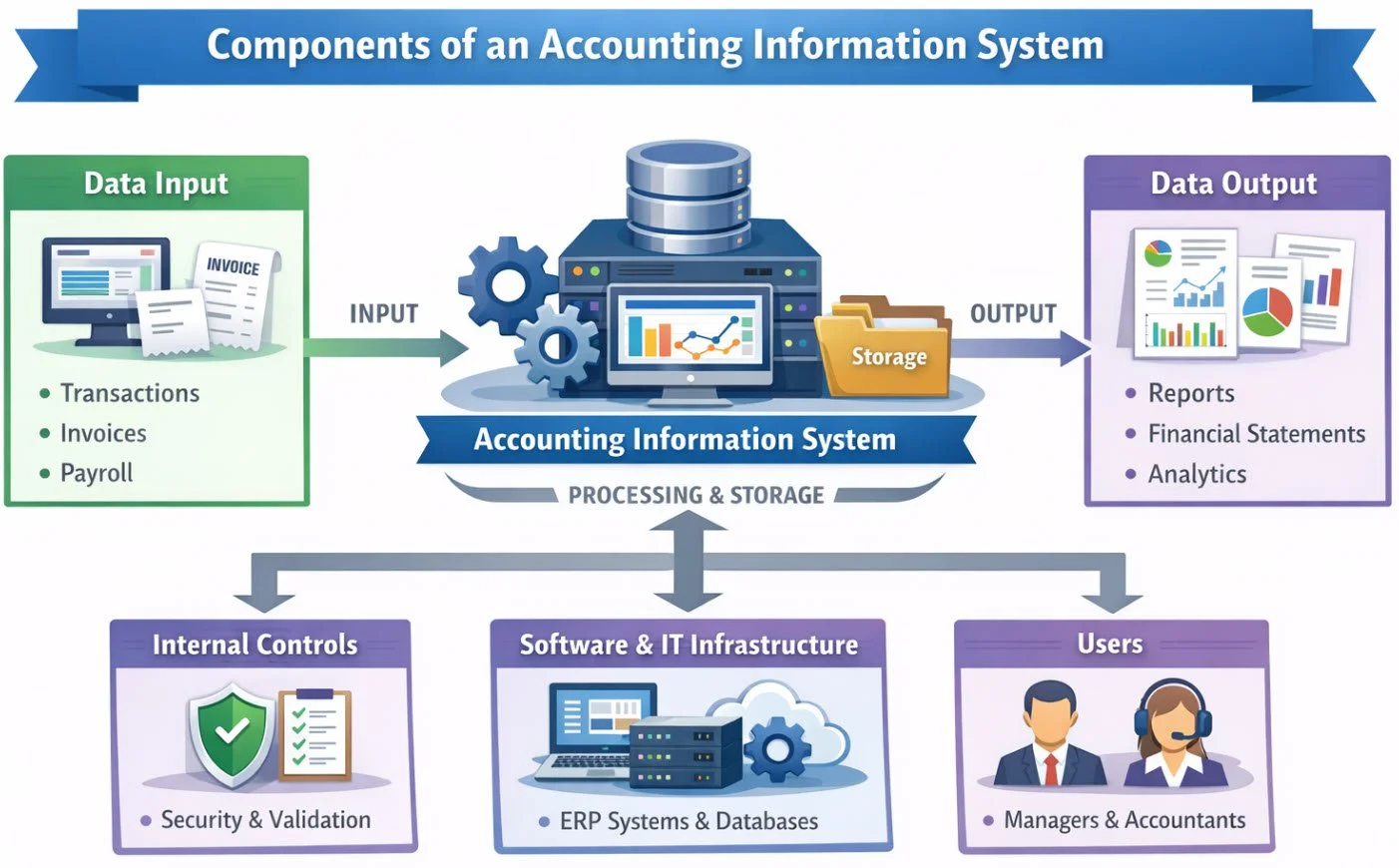 An accounting information system accepts data inputs from a variety of sources, such as sale transactions, cash receipts, supplier invoices, and payroll time cards. These inputs are stored within the AIS, which uses a number of internal controls to validate them. The system then generates outputs as needed, which include financial statements, analytics, and department-level reports. The outputs are used not only by accountants, but also by managers and other personnel throughout the organization. The basic components of an accounting information system are shown in the following exhibit.
