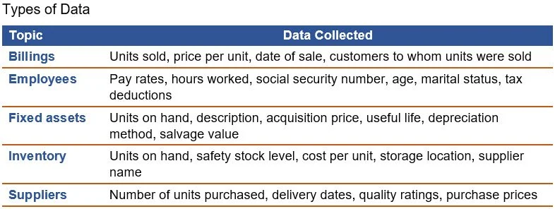 Data are stored in an AIS. Data are facts that are collected, stored, and used by an organization. There are many types of data needed by a company, as noted in the following exhibit.
