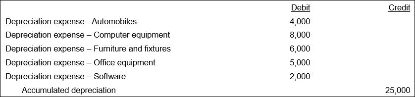 For example, a company controller calculates that the total depreciation for the month of May for all assets is $25,000. This results in the following entry, where the company charges $25,000 to depreciation expense and places the offsetting credit in the accumulated depreciation account (which is a contra asset account that offsets the fixed assets line item on the balance sheet):
