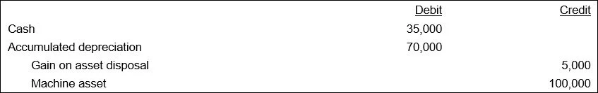 Alternatively, you may sell an asset, so that you receive cash (or some other asset) in exchange for the fixed asset being sold. Depending upon the price paid and the remaining amount of depreciation that has not yet been charged to expense, this can result in either a gain or a loss on sale of the asset. In the following sample entry, a business sells a machine that cost it $100,000, receiving $35,000 from the buyer. The seller has already recorded $70,000 of depreciation expense.