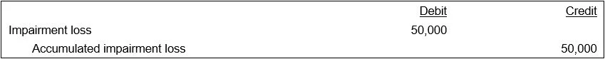 As an example of a fixed asset impairment journal entry, the following example shows the recognition of a $50,000 impairment charge against an asset. The impairment loss is an expense in the current period, while the offsetting accumulated impairment loss is a contra asset that is offset against and reduces the remaining asset balance.