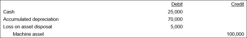What if the business had sold the machine for $25,000 instead of $35,000? Then there would be a loss of $5,000 on the sale. The entry would be: